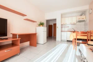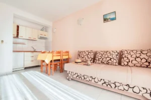 Apartmány se nacházeí v blízkosti písečné pláže, cca 800 m od centra Omiše. Na nejbližší pláž je možné využívat podchod. Krásná písečná pláž je také v nedalekém centru města. Apartmány A2+2 mají jednu ložnici a kuchyni s přistýlkou (rozkládací gauč), WI-FI, TV, chladničku, myčku nádobí, vařič, balkón, sociální zařízení. Studia – dvě – mají v jedné místnosti manželskou postel a kuchyňský kout, dále balkón, sociální zařízení.